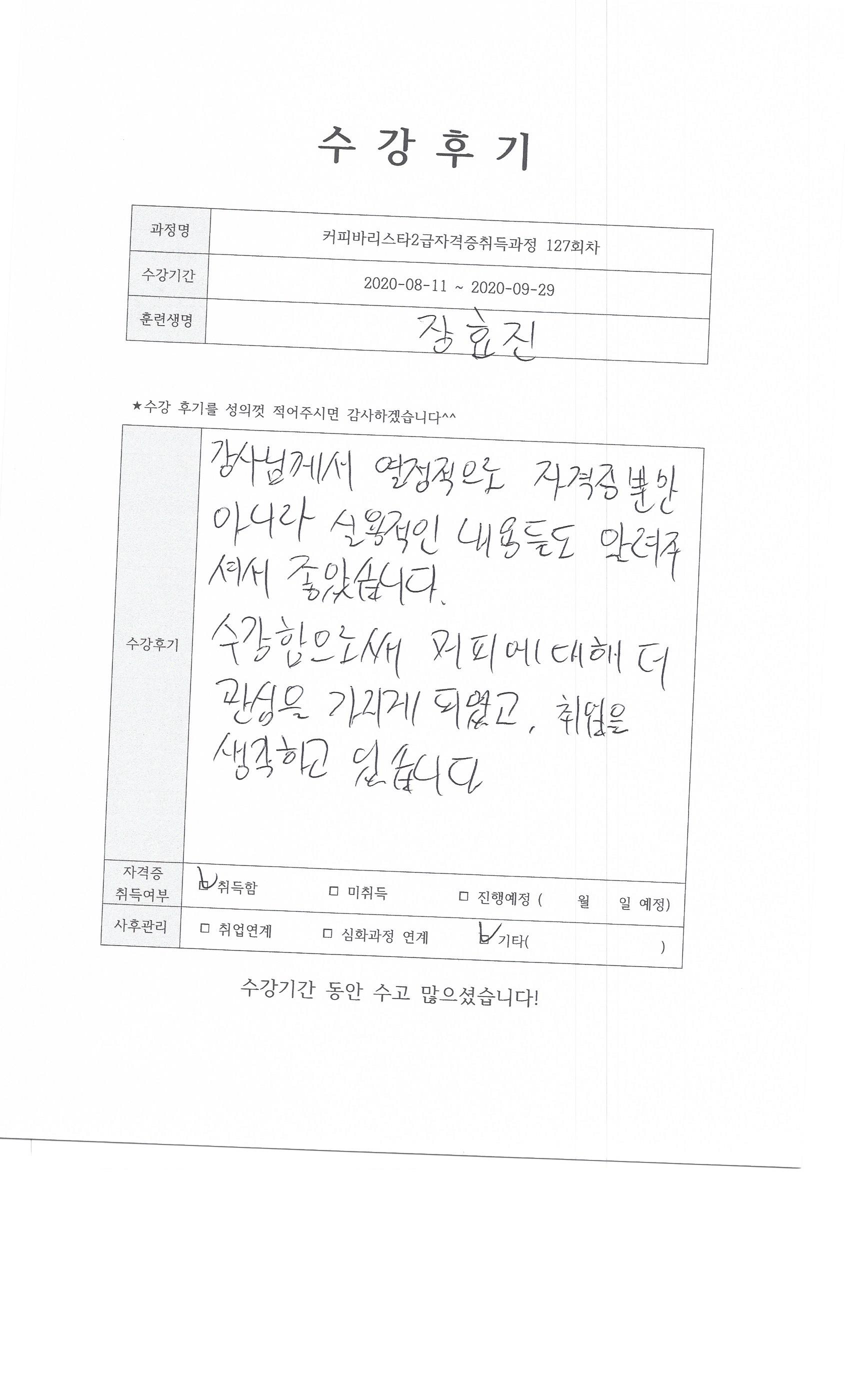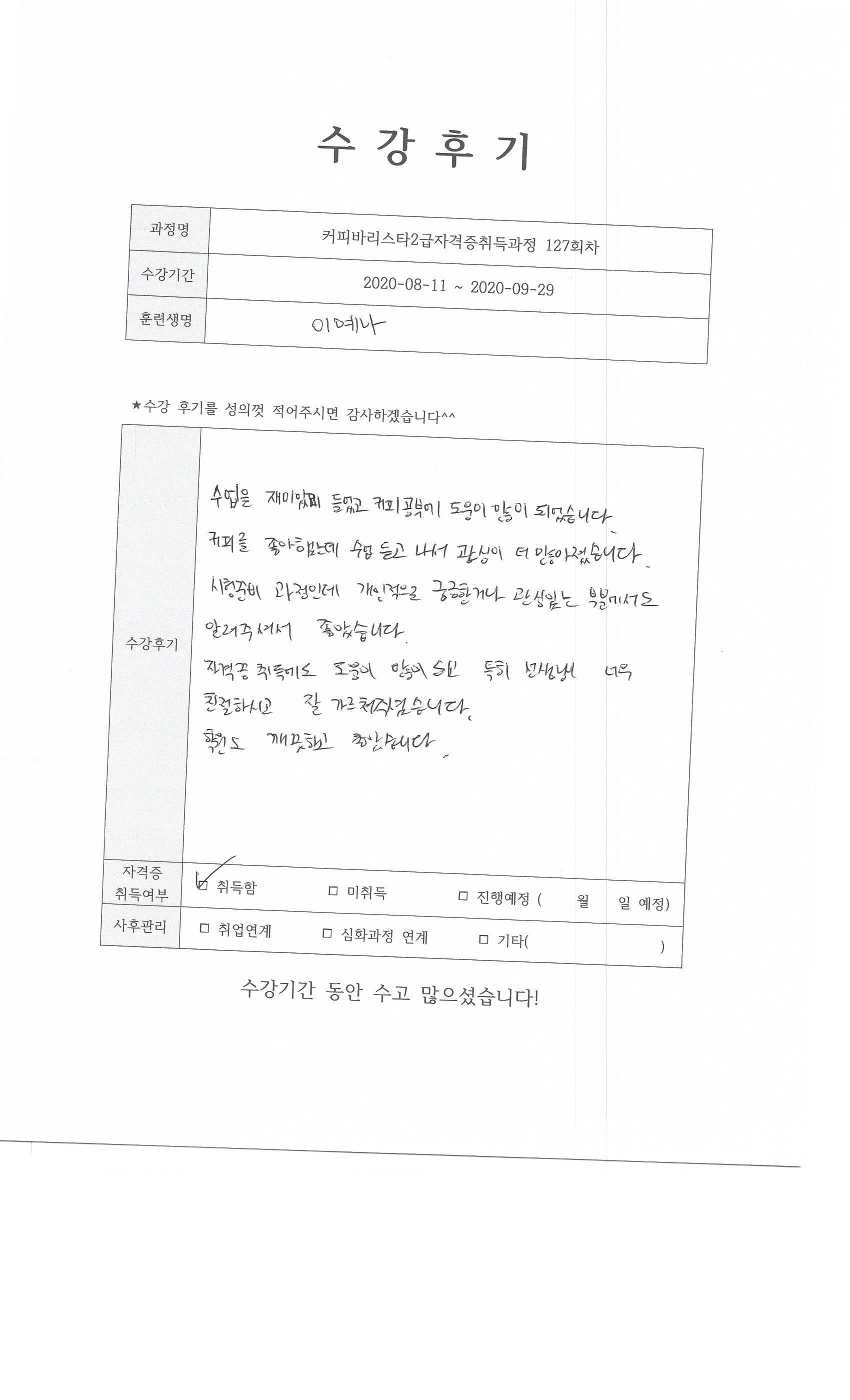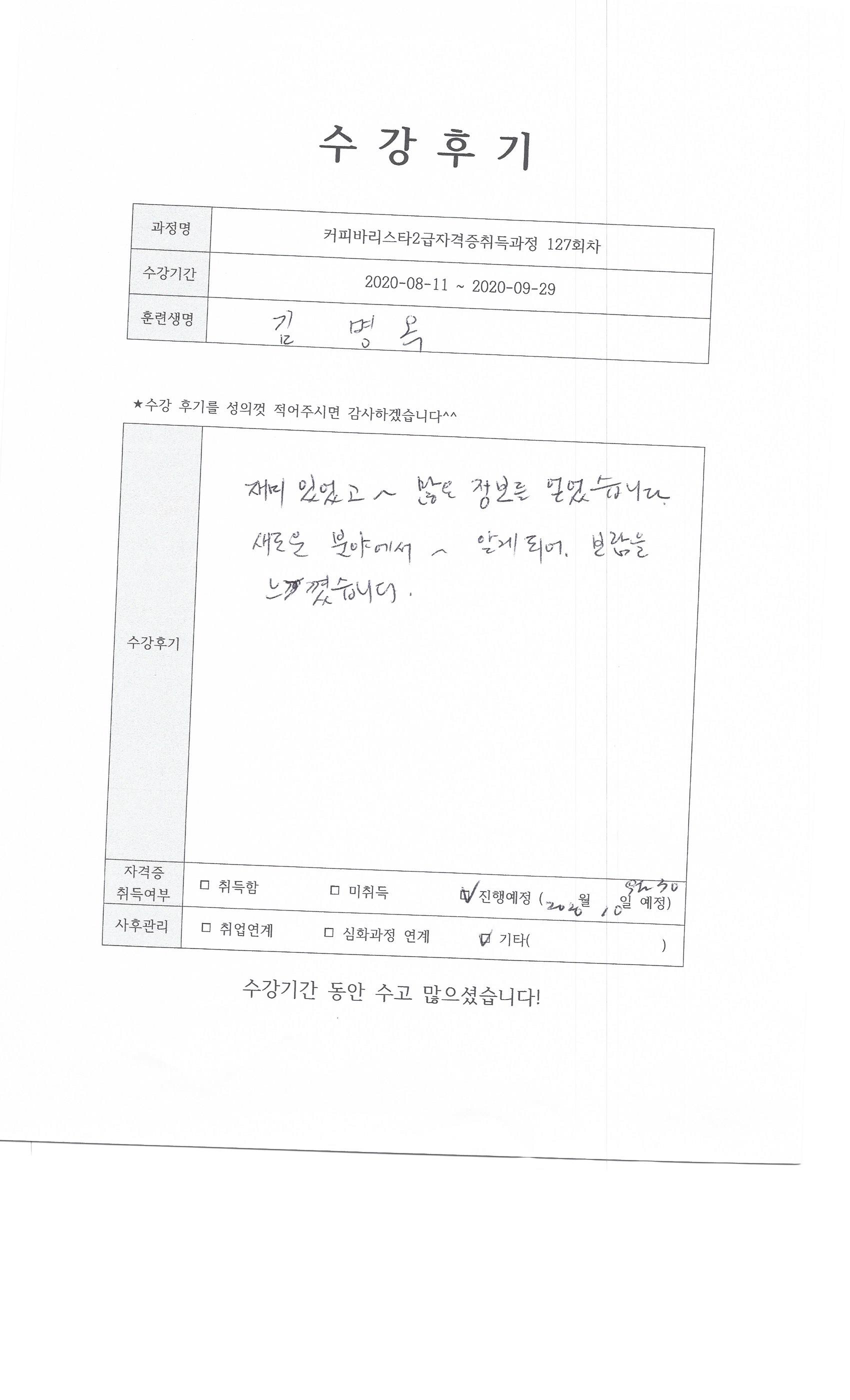 커피바리스타2급자격증취득과정 116회차 수강후기