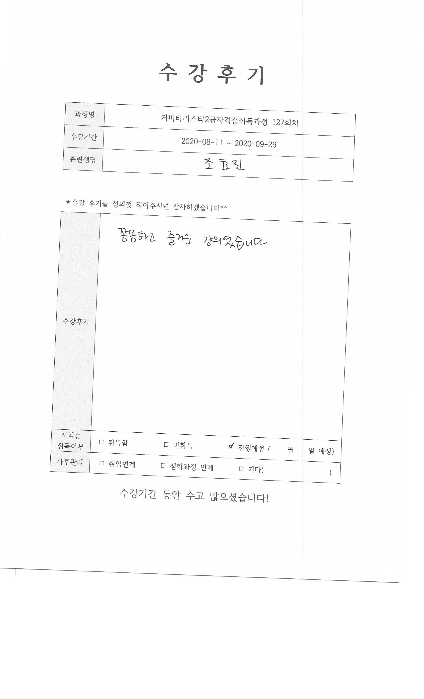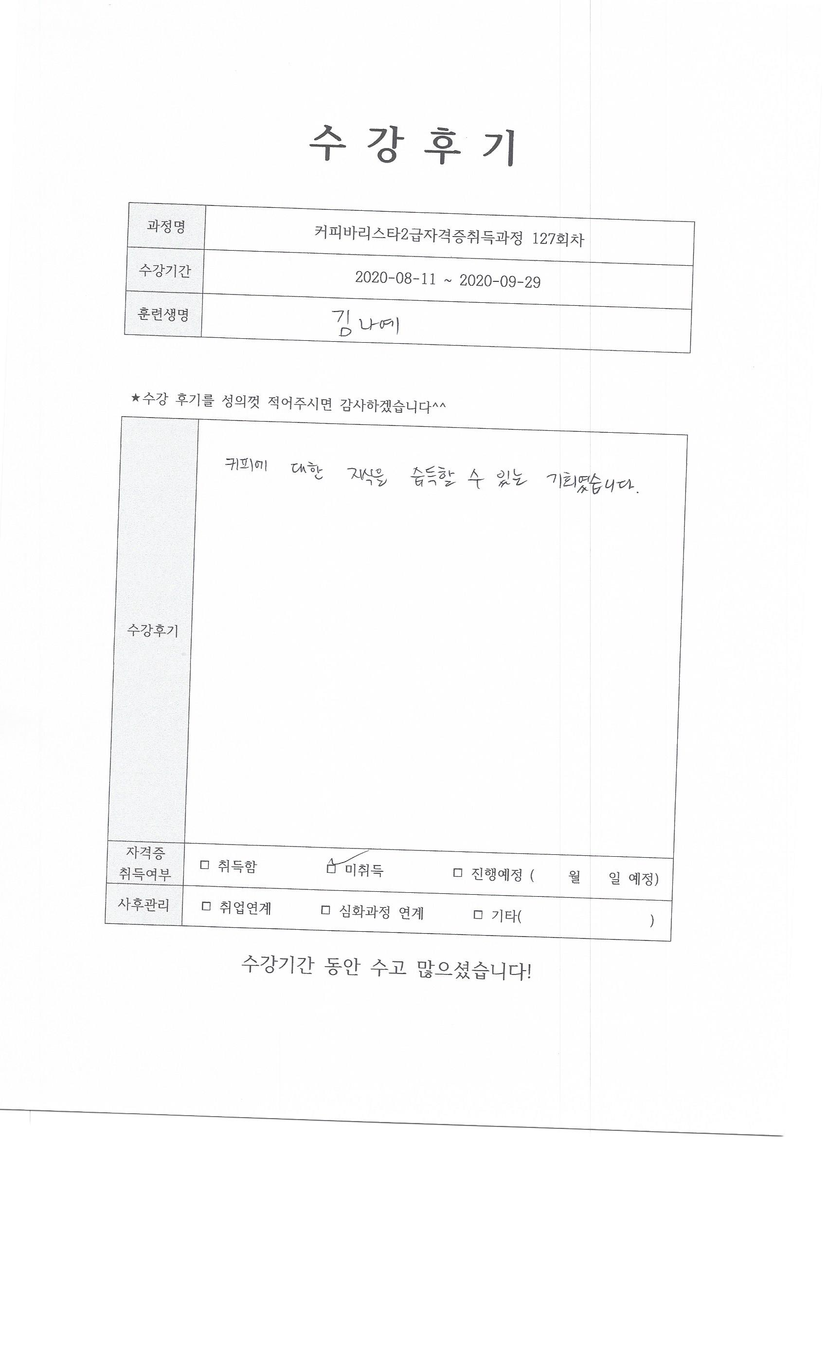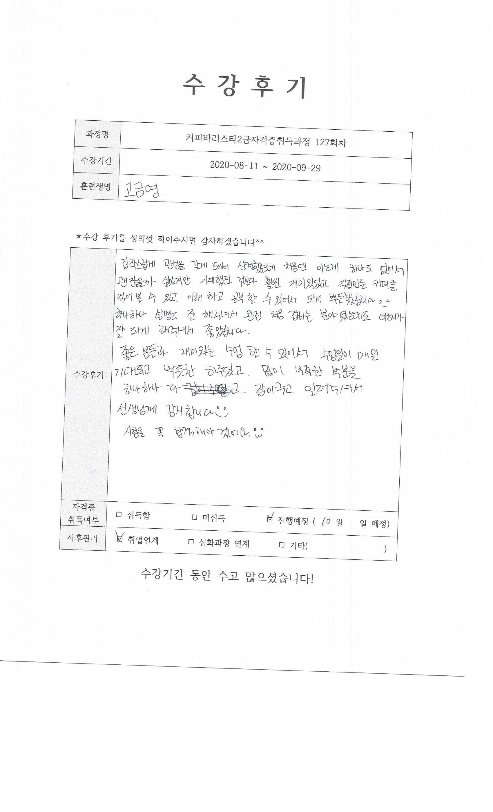커피바리스타2급자격증취득과정 116회차 수강후기