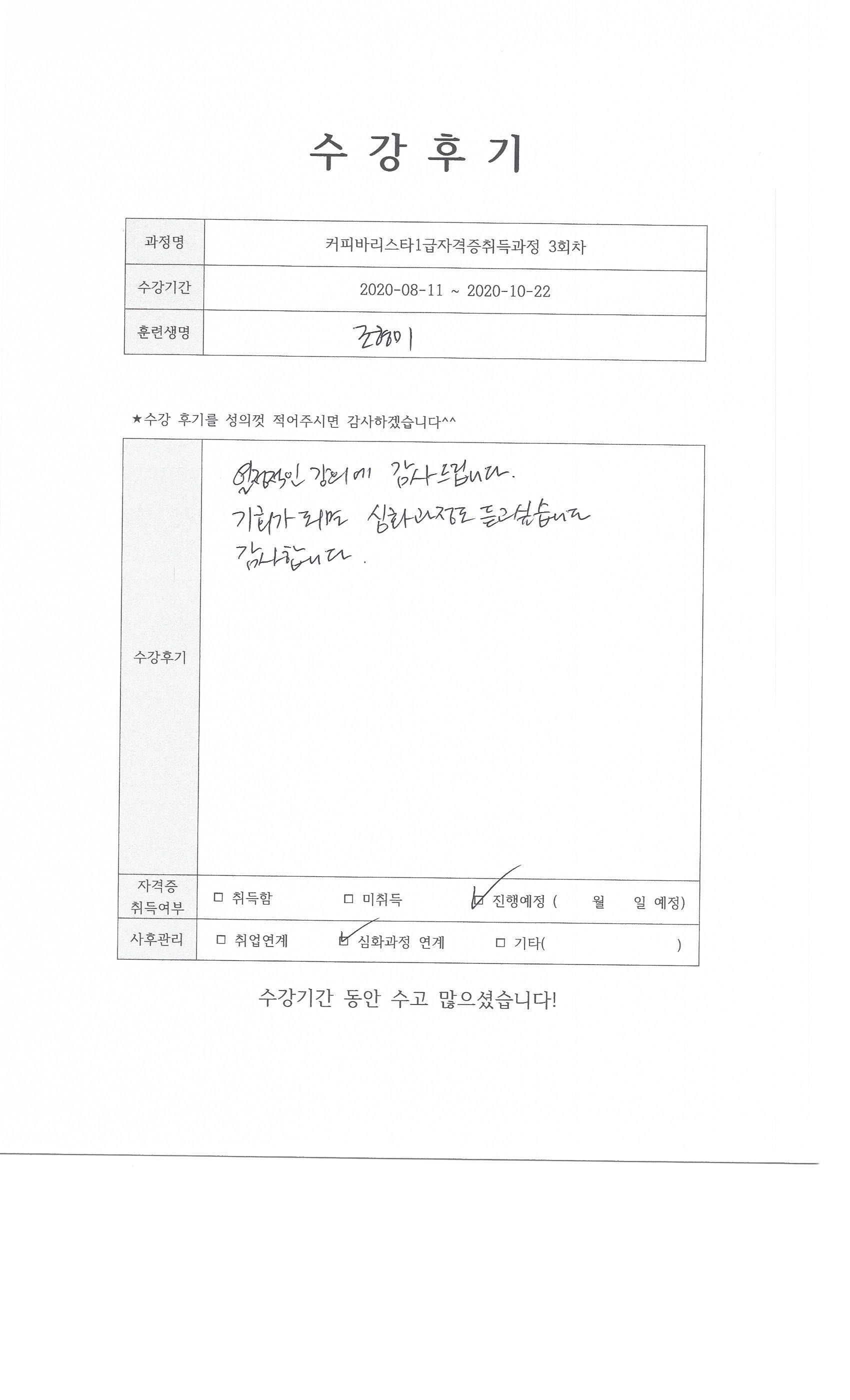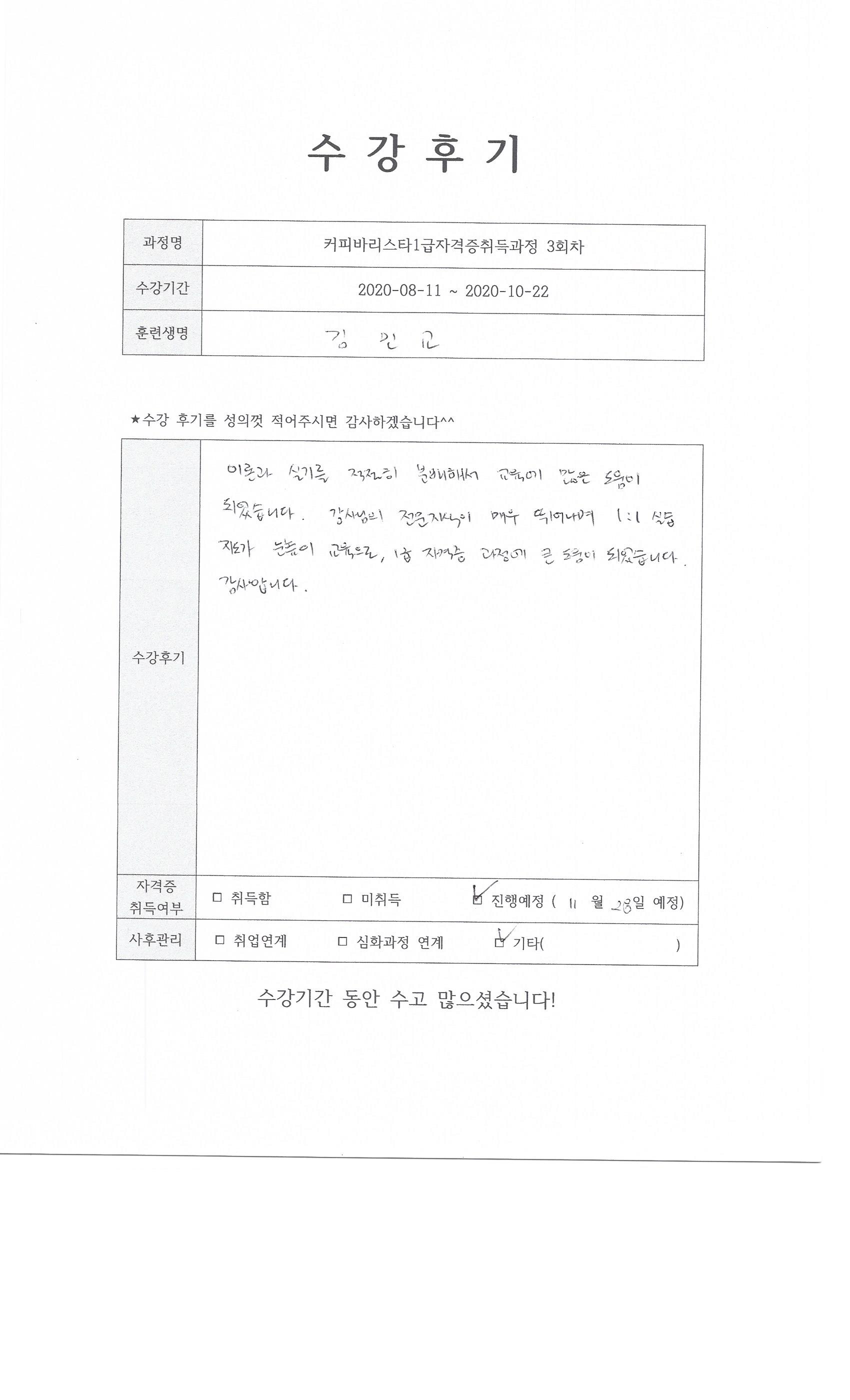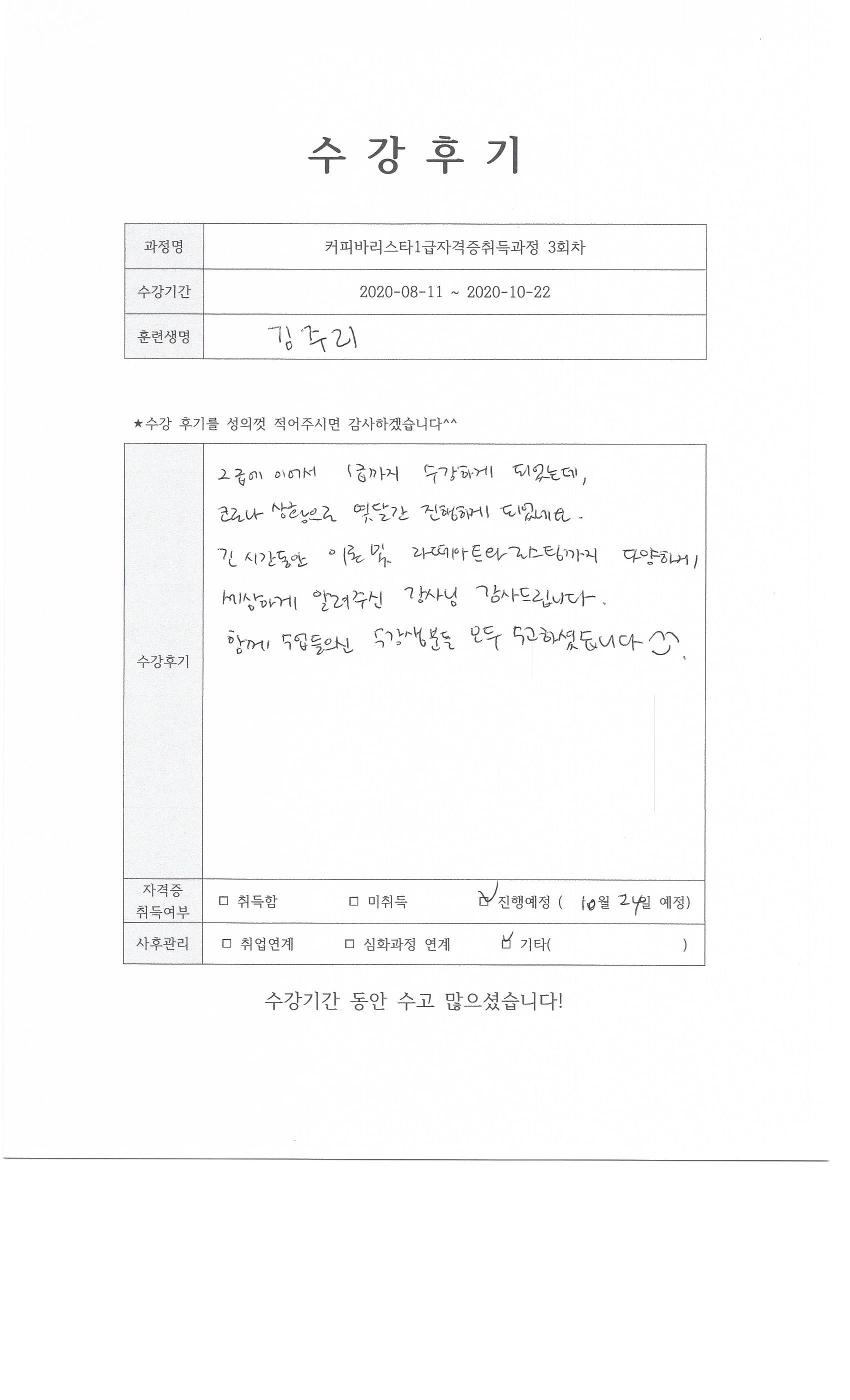 커피바리스타1급자격증취득과정 10회차 수강후기