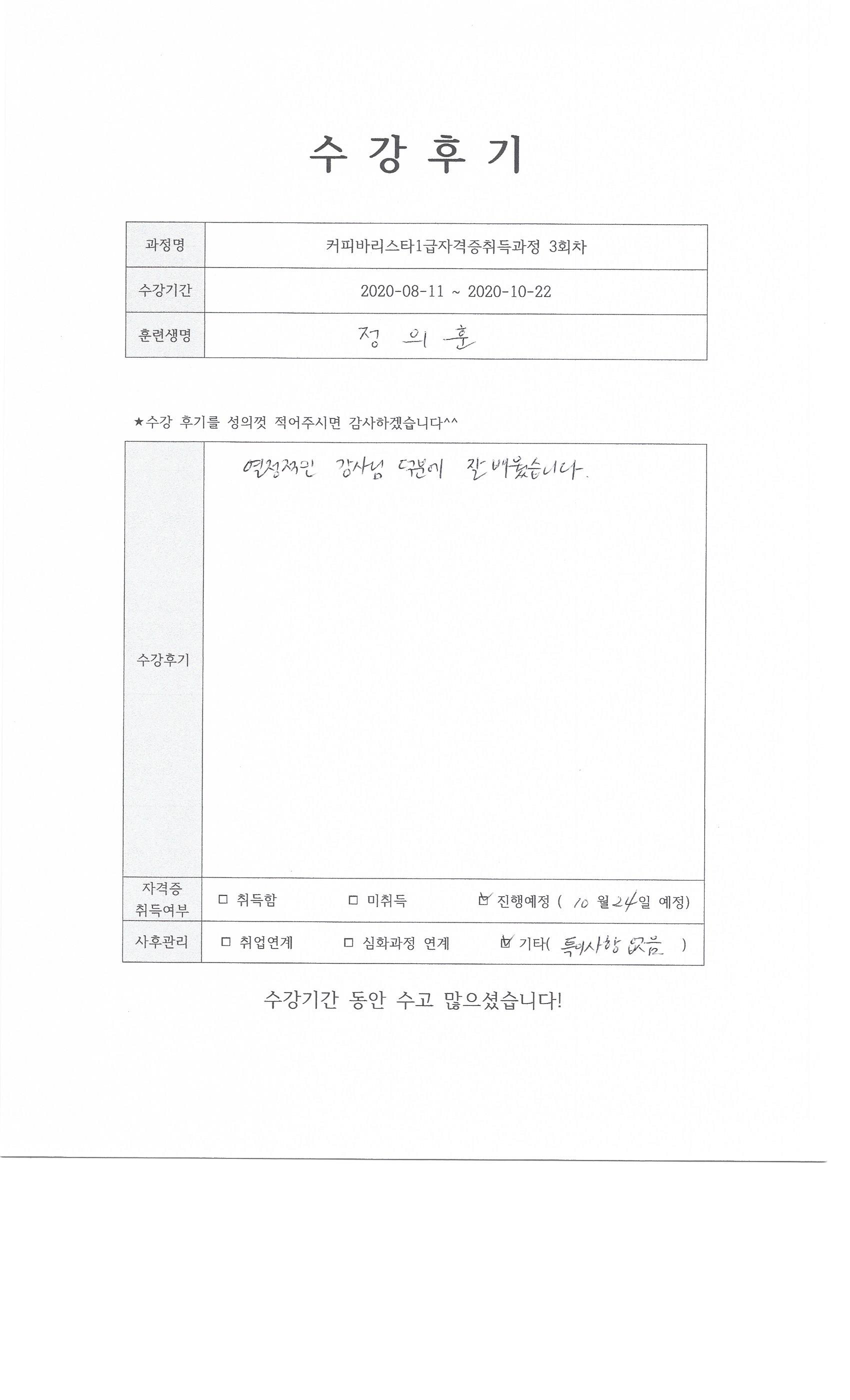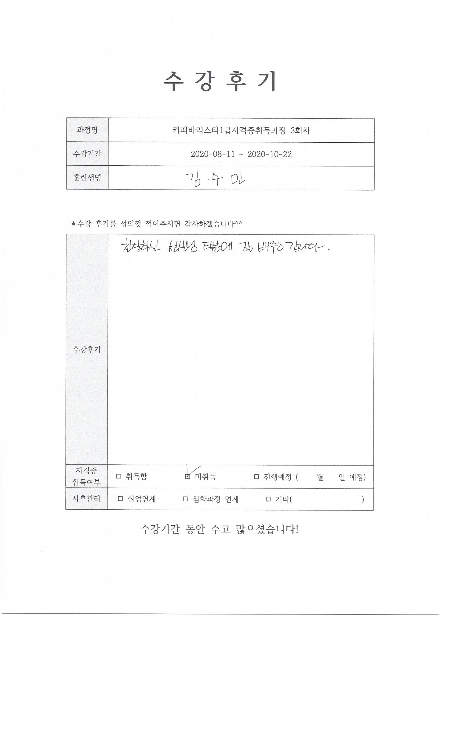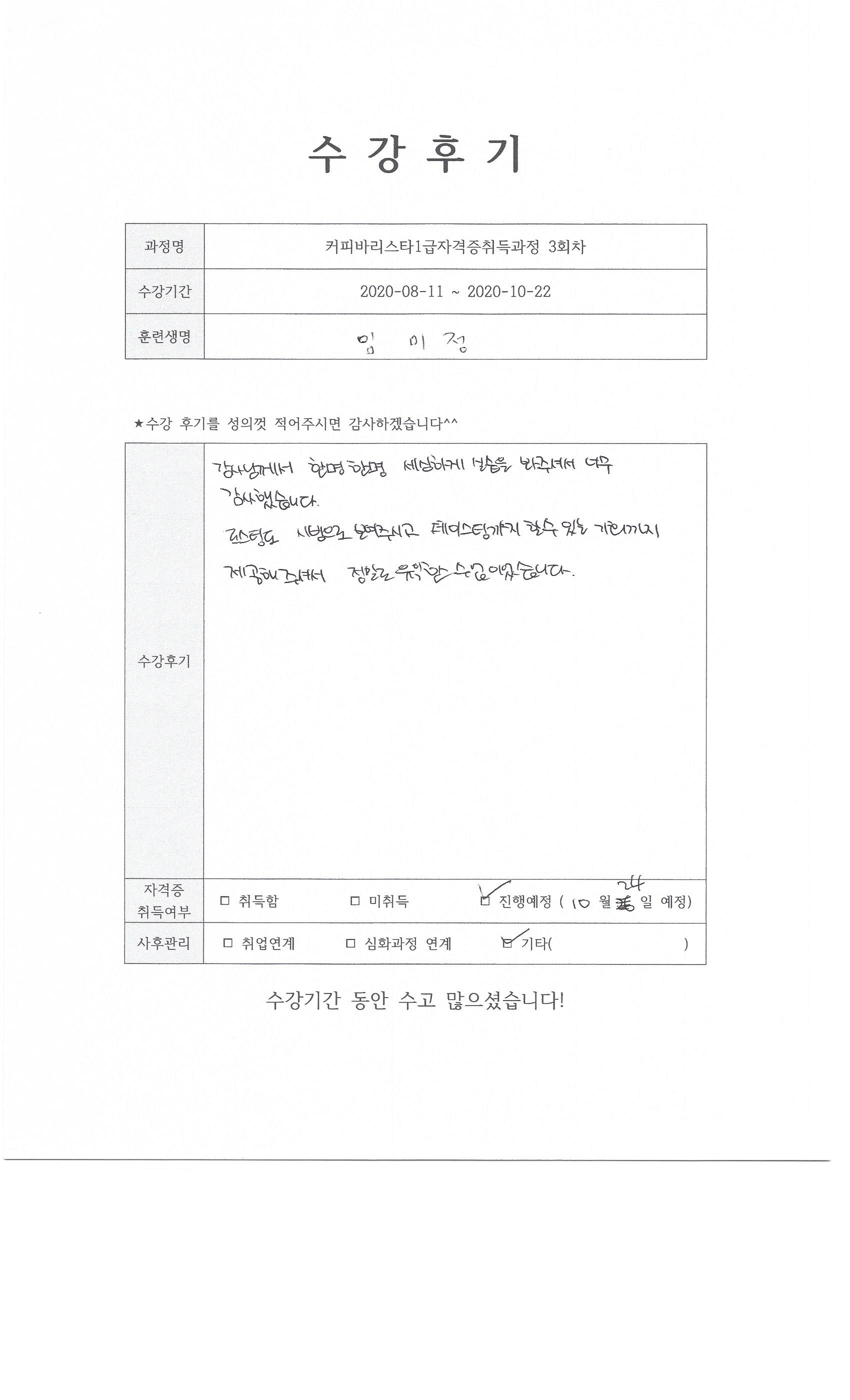 커피바리스타1급자격증취득과정 10회차 수강후기