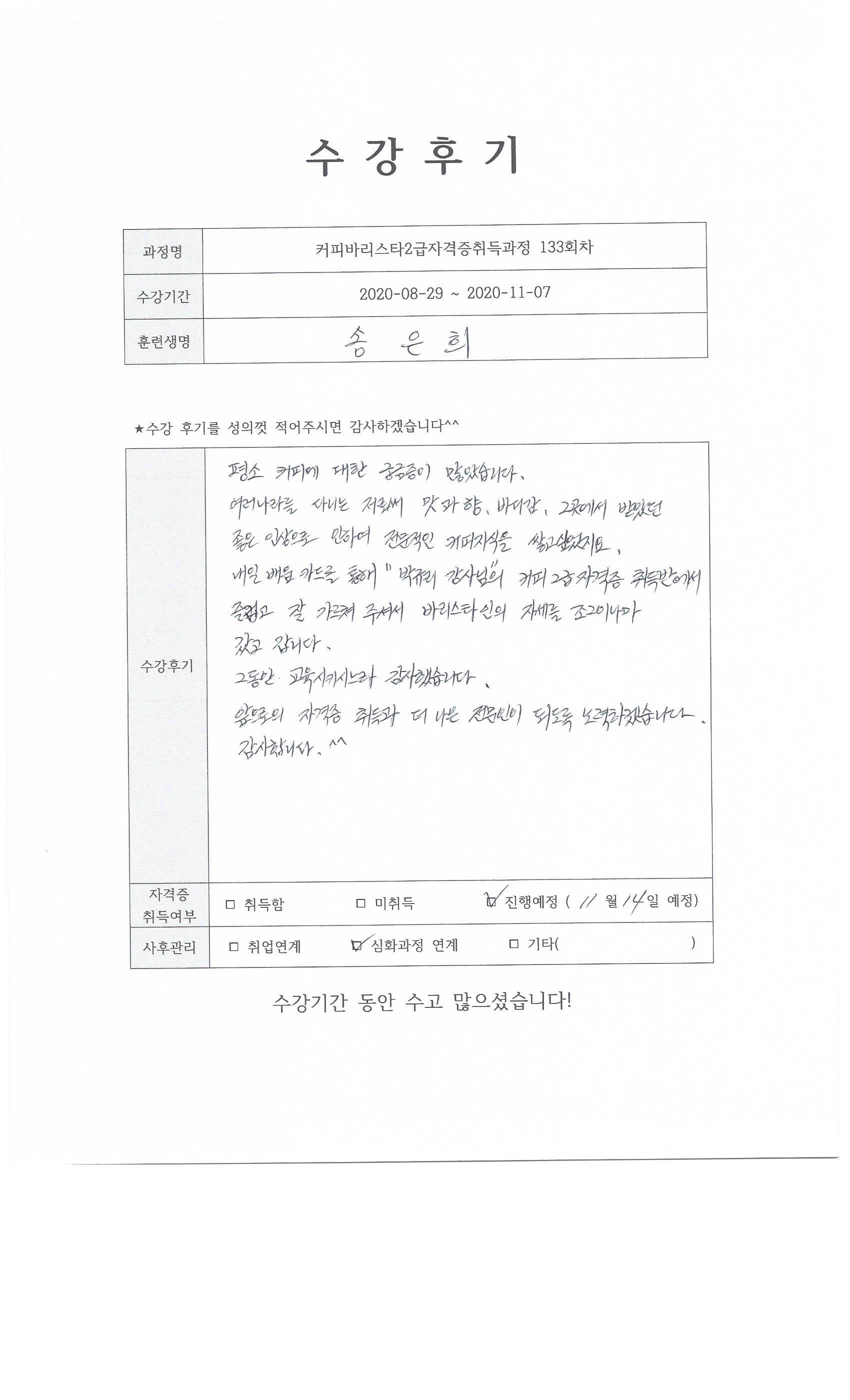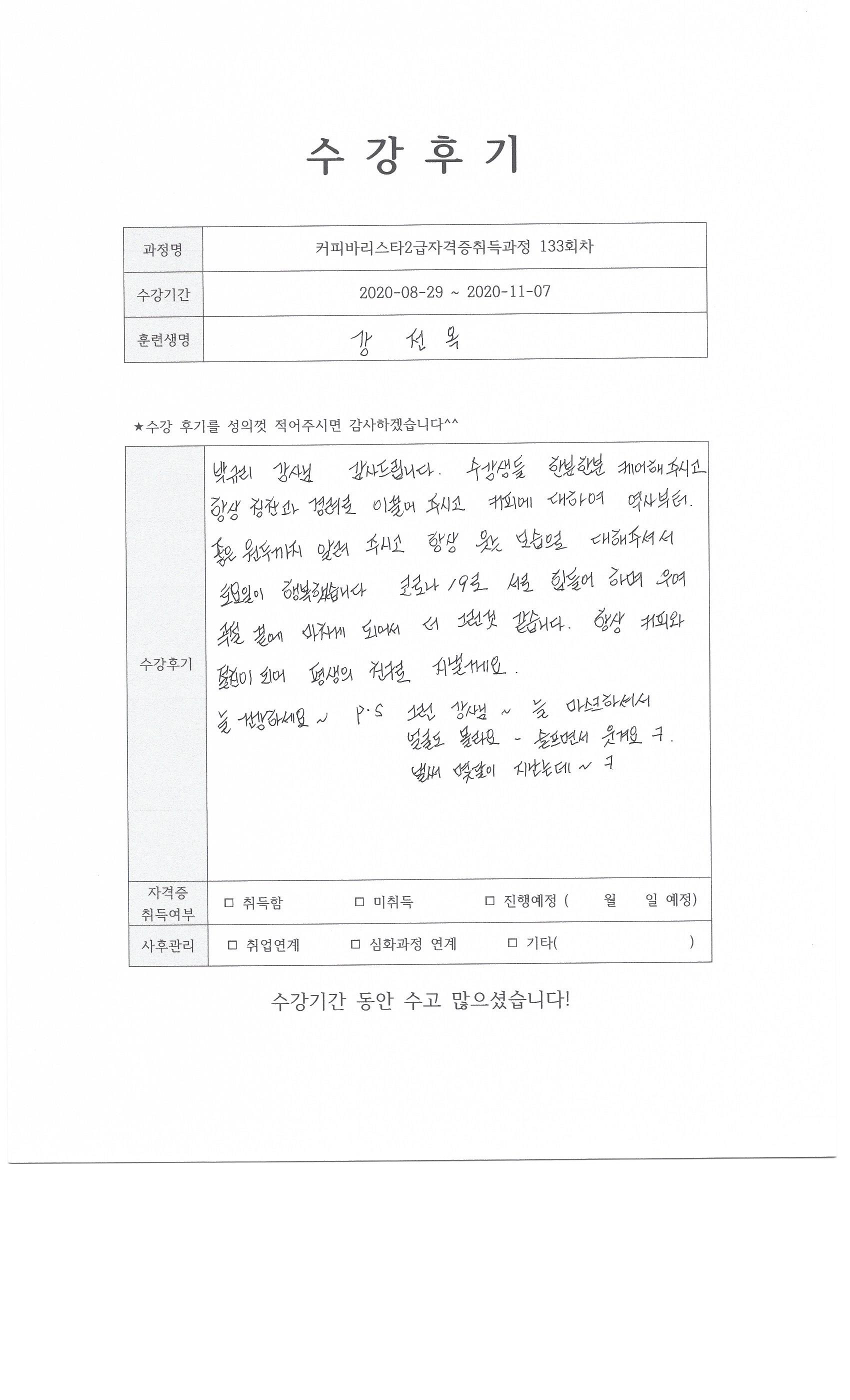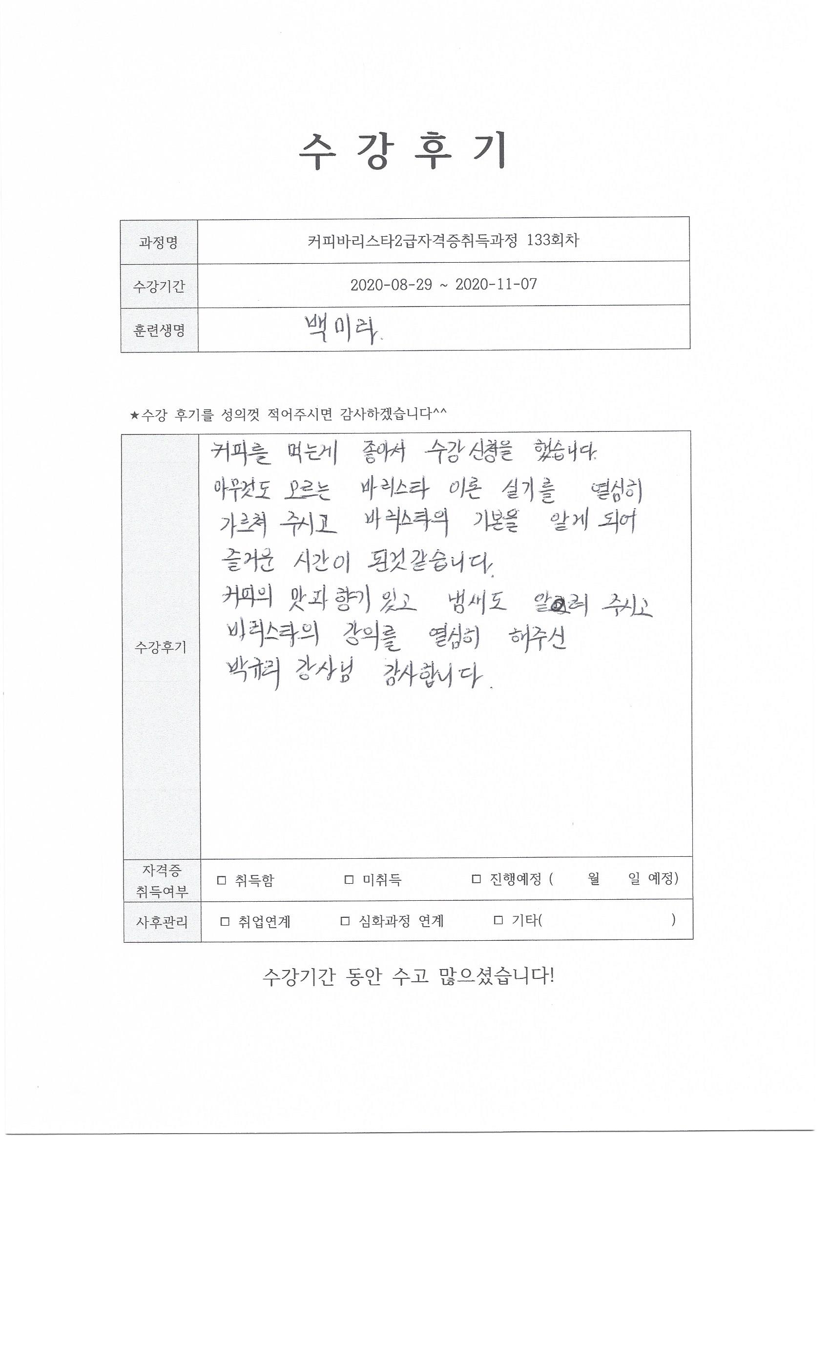 커피바리스타2급자격증취득과정 133회차 수강후기