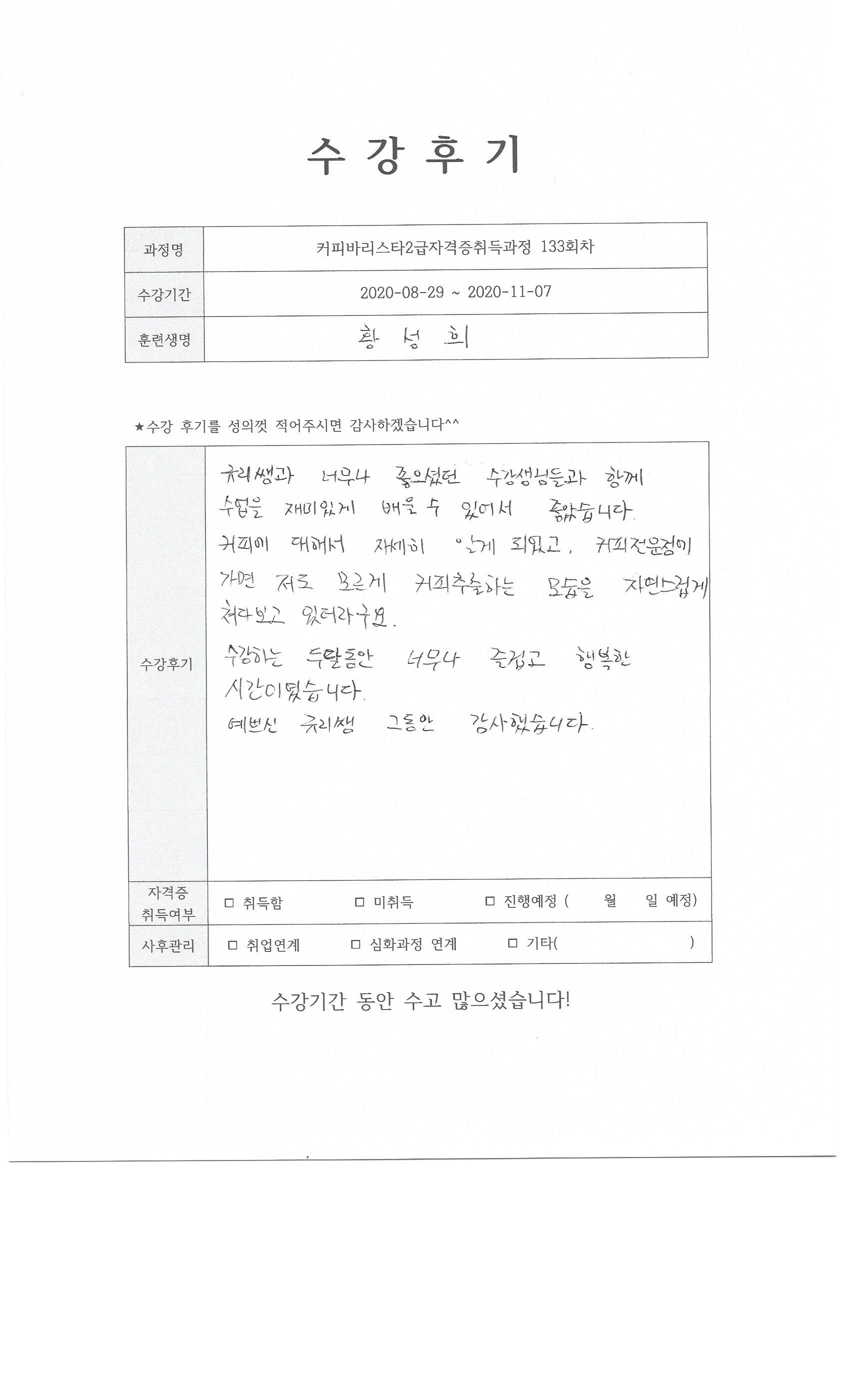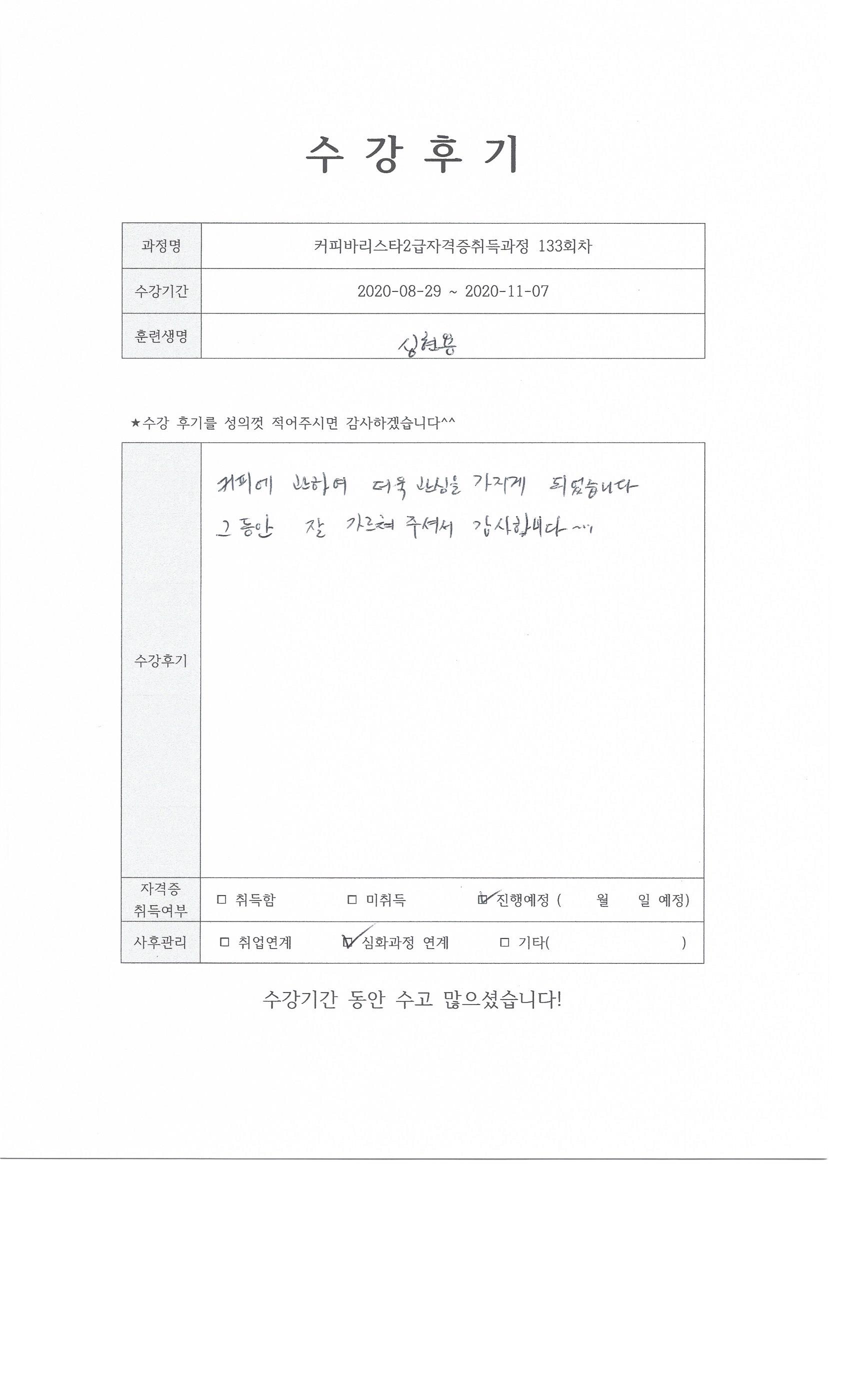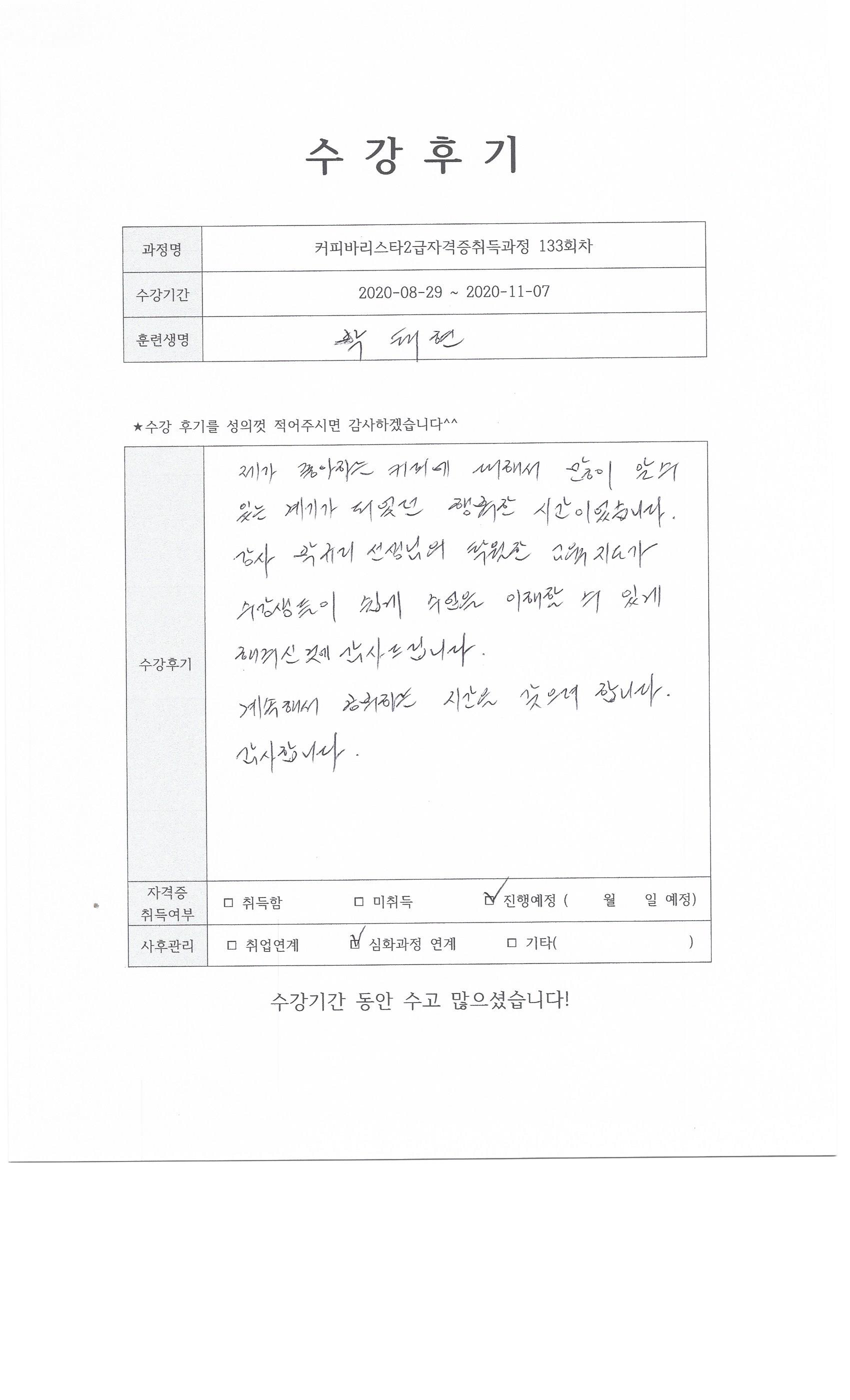 커피바리스타2급자격증취득과정 133회차 수강후기