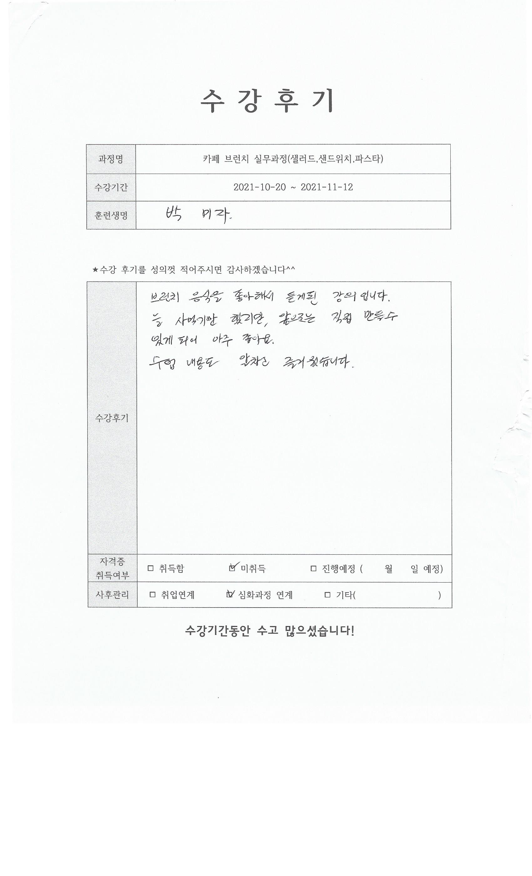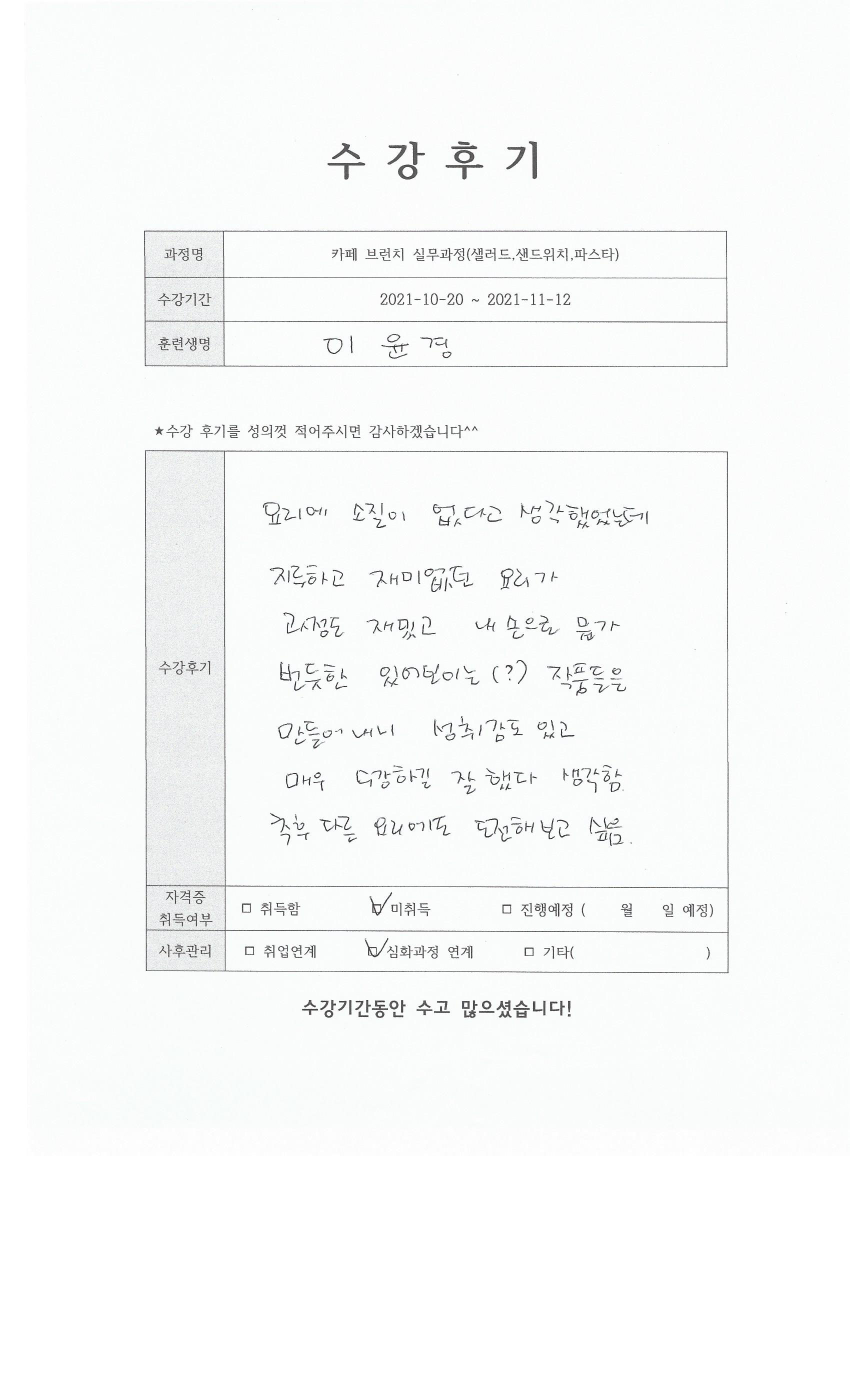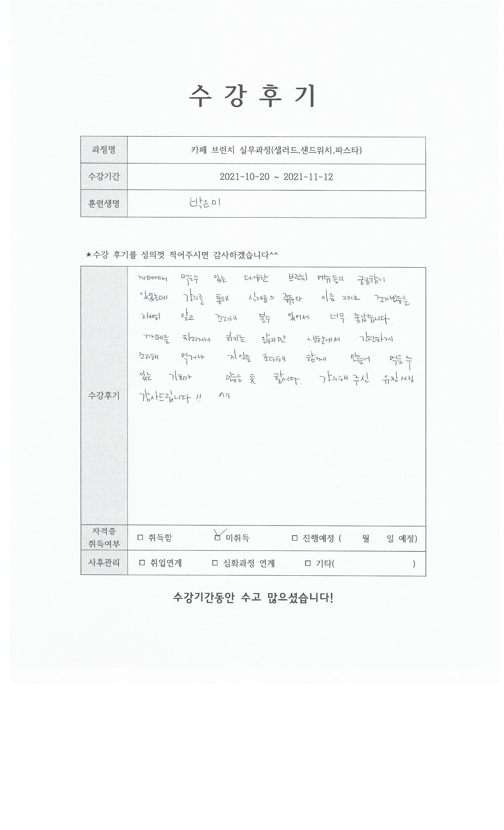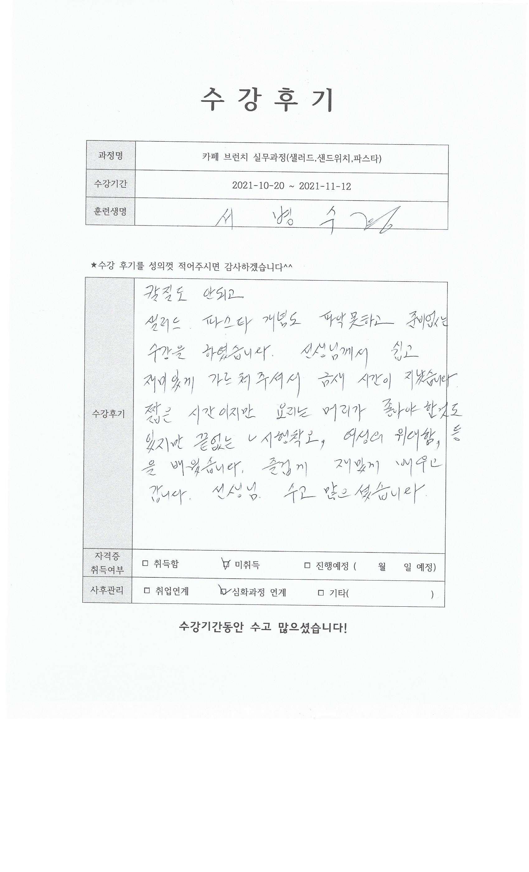 카페 브런치 실무과정(샐러드,샌드위치,파스타) 85회차 수강후기
