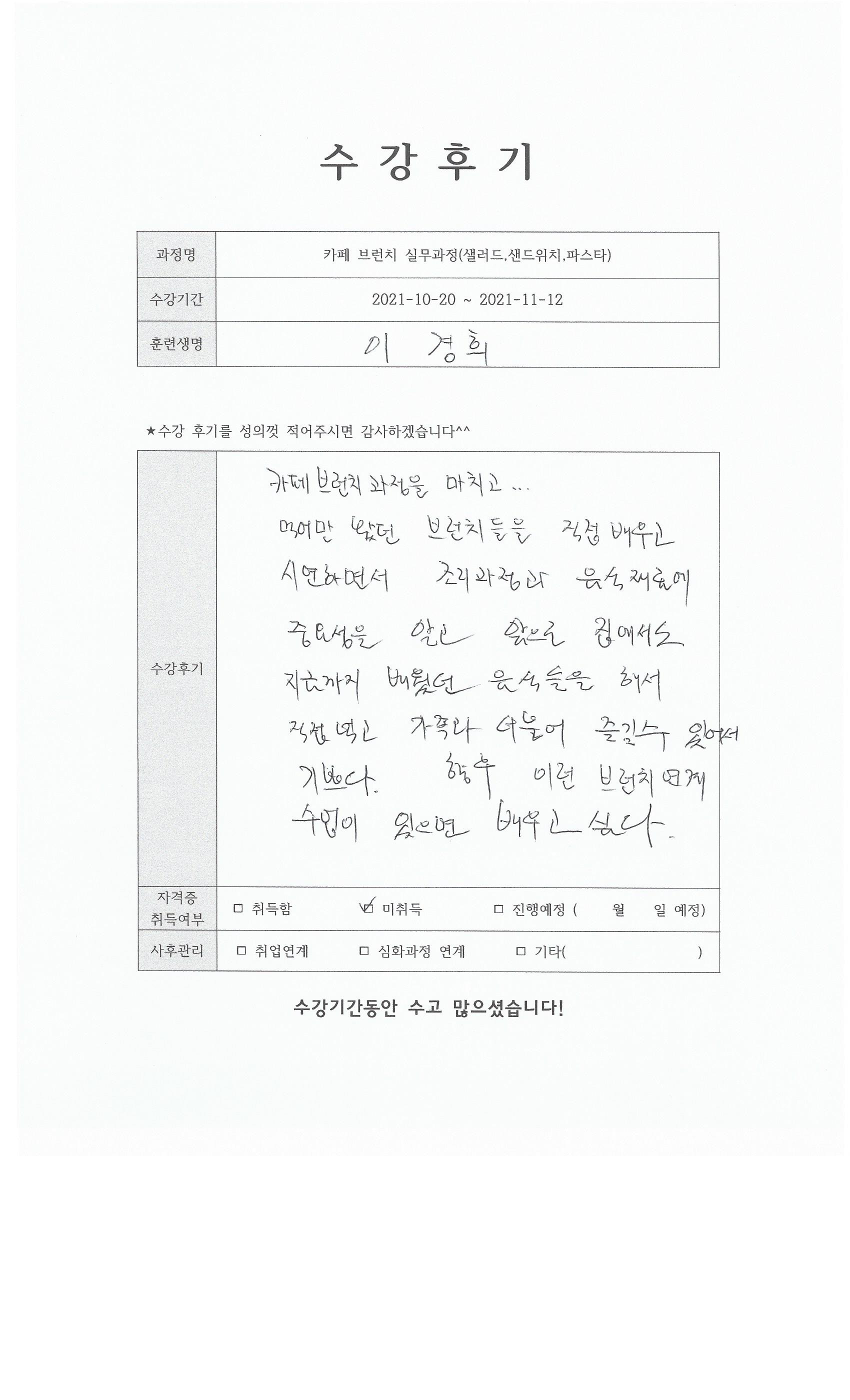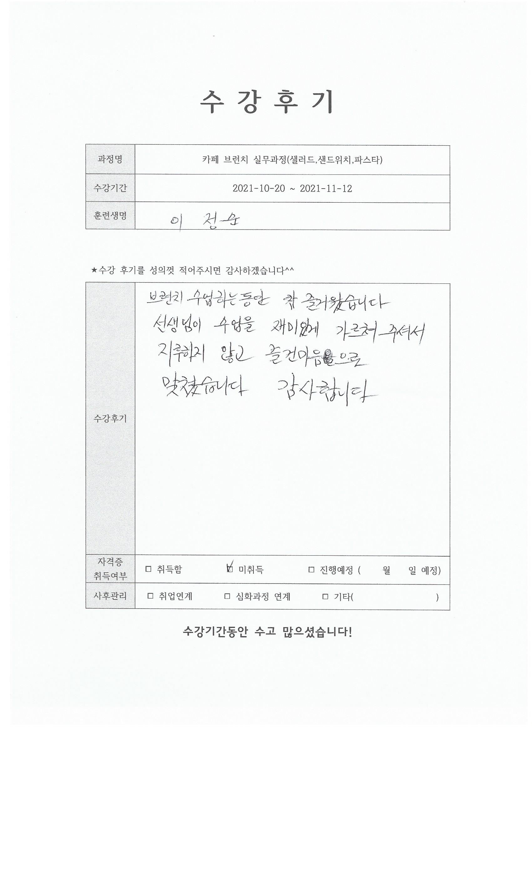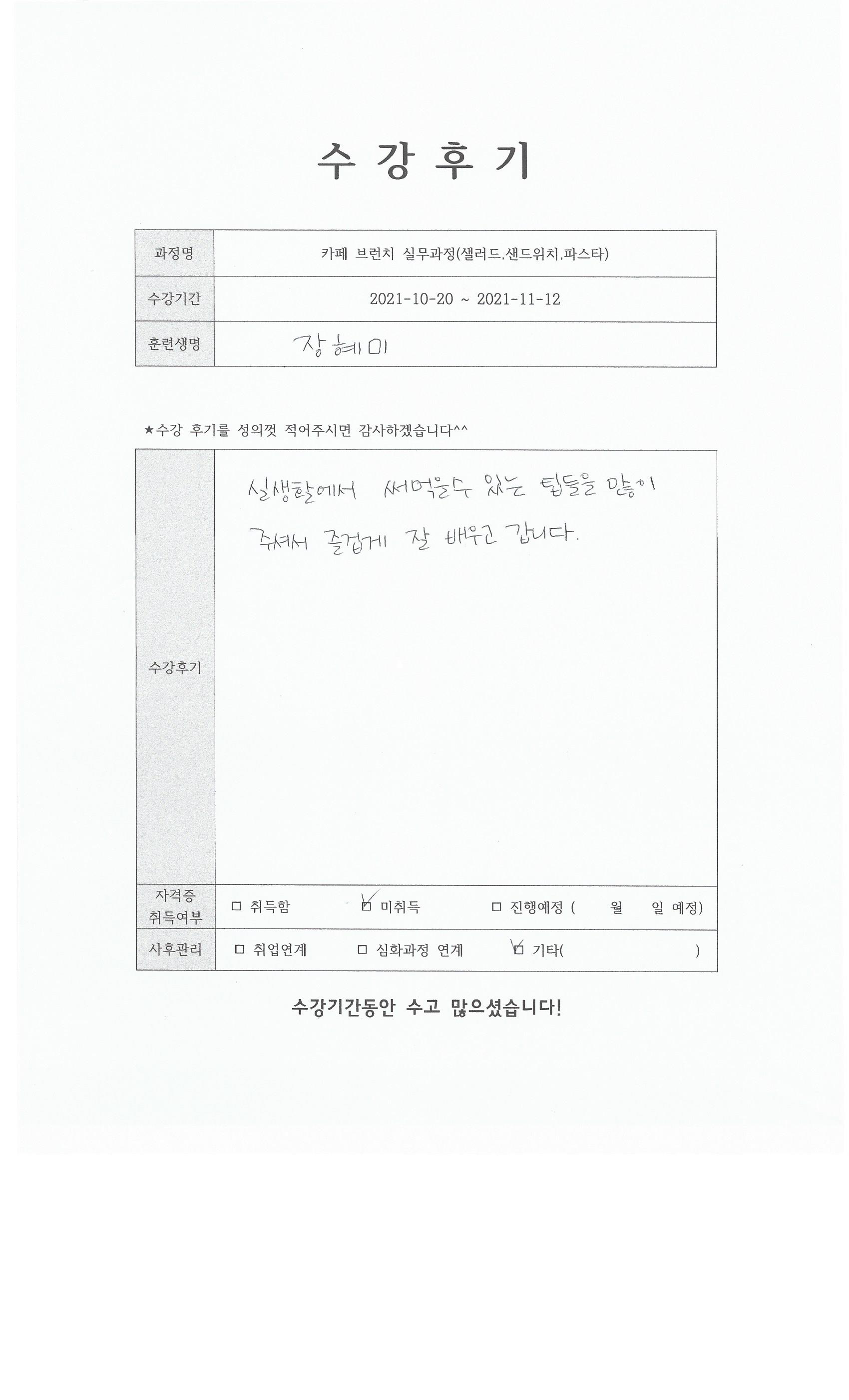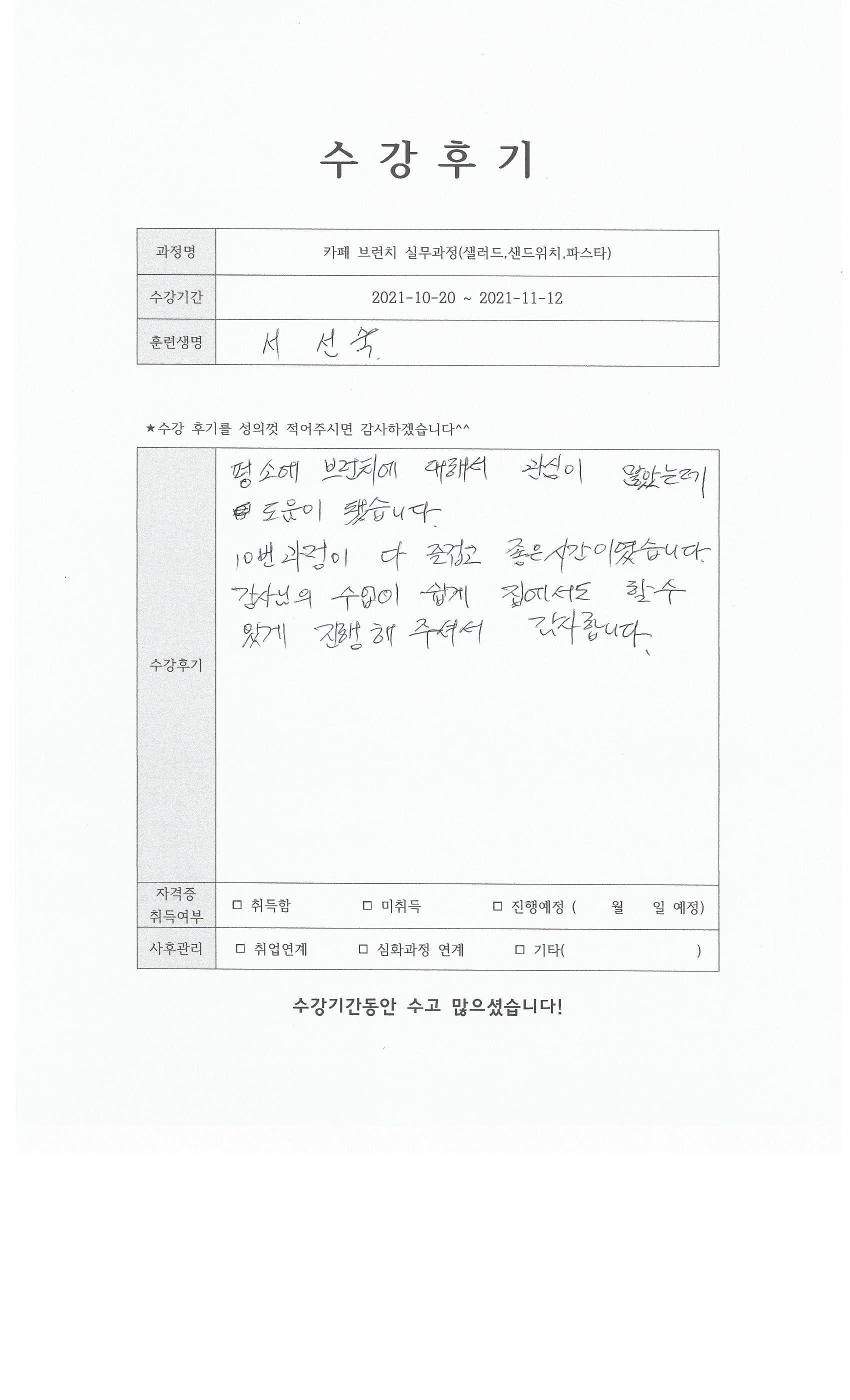 카페 브런치 실무과정(샐러드,샌드위치,파스타) 85회차 수강후기