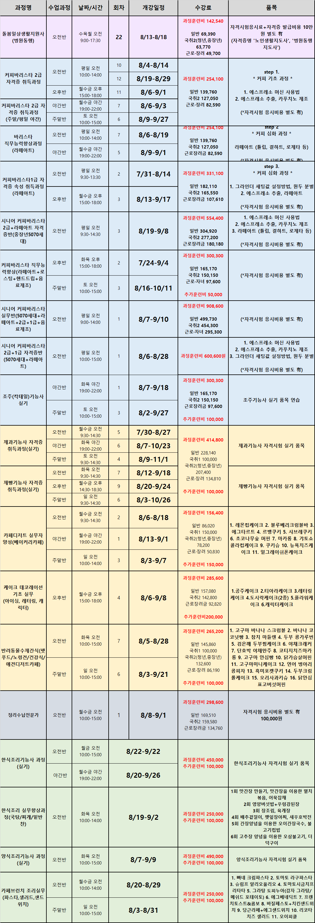 2025년 8월 국비 및 일반 과정 개강일정표 안내